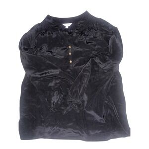 Keywords: Lilly Pulitzer blouse, black silk top, smocked neck blouse, long sleeve silk shirt, V-neck button up top, designer women's clothing, elegant blouse, luxurious silk top, gathered neckline shirt, gold button blouse, billowy sleeve top, women's fashion