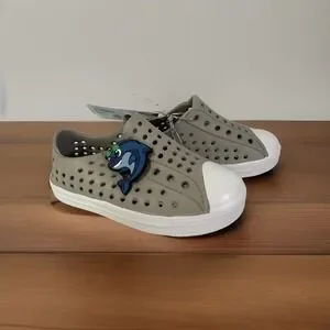 Seannel introduces a pair of lightweight, breathable, and waterproof slip-on shoes for unisex kids. These shoes are perfect for travel, activewear, and casual occasions during summer and spring. The slip-on style shoes have a round toe shape and a flat heel style with a heel height of under 1 inch. The shoes are designed with a solid gray color and feature a medallion accent, whale, and boy character. The outsole material is made of rubber, and the insole material is also made of rubber. The shoes have a standard shoe width and a 1mm heel to toe drop.