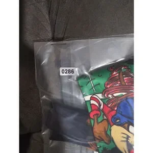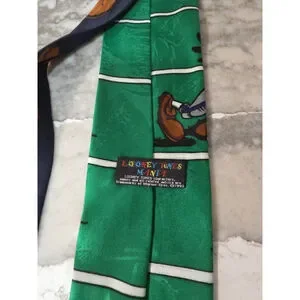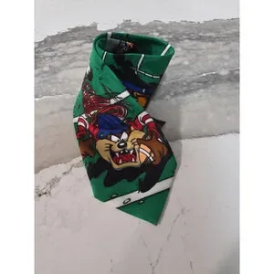 This vintage 1993 Bugs Bunny Looney Tunes men's tie features a football tie design with the iconic character Bugs Bunny and the Looney Tunes logo accents. Made of polyester in a classic green color, this tie is 57"-60" in length and width, and is adjustable for a custom fit. Perfect for fans of classic cartoon characters, this pointed tie is a stylish and nostalgic addition to any man's wardrobe.