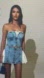 Light blue denim crop top. Strapless design with button details. White lace trim adds elegance.