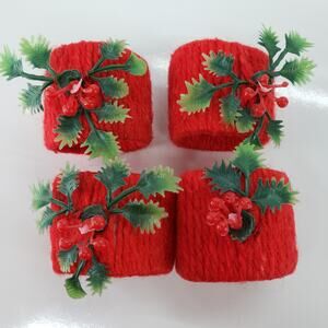 VTG 1960s-70s MCM 4 Napkin Rings Yarn Wrap Red Plastic Holly Christmas Holiday