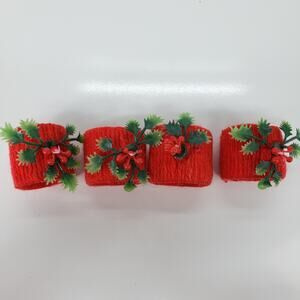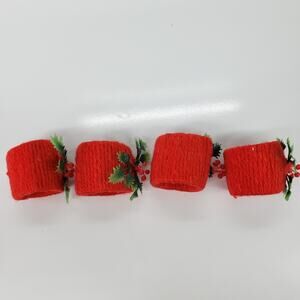 Vintage 1970s ? MCM 4 Napkin Rings Yarn Wrap Red Plastic Holly Christmas Holiday