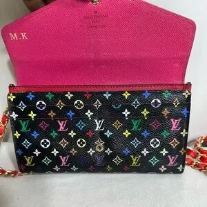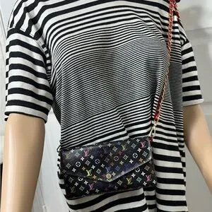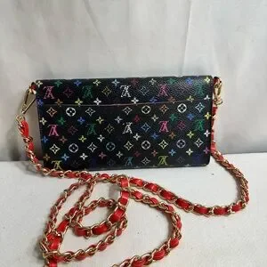 Stylish and iconic, this Louis Vuitton women's bag features a vibrant multicolor monogram on a sleek black background. Perfect for adding a touch of luxury to any outfit.