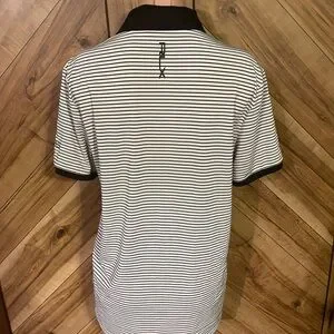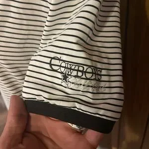 This men's size Medium short sleeve polo features a crisp black and white horizontal stripe pattern with a sharp black collar and a three-button hidden Henley placket. The ultimate detail is the embroidered "Cowboys Golf Club" logo on the left sleeve, making it a must-have for any Dallas Cowboys fan or golf enthusiast.