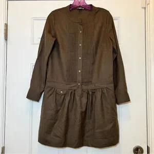 J. Crew Pin Tucked Dropped Waist Long Sleeve Dress 100% Wool Olive Brown Size 4 Small