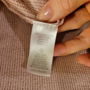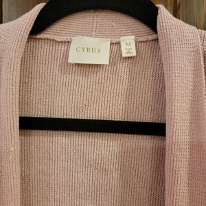 EUC light pink mauve cardigan by Cyrus. Soft knit fabric. Ideal for layering. Pit to pit was hard to measure since it is an open style, but just laying it flat, it measures about 22.5 inches across and 23.5 in length. The color is the deeper pink, like the last 3 images. Beautiful and simple waffle knit pattern.