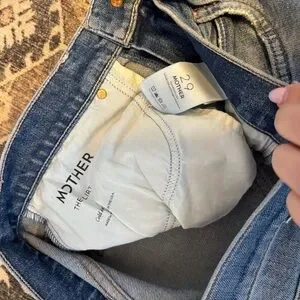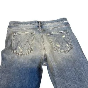 The Mother denim jeans feature light fading and whiskering with destroyed detail. The jeans have front and back pockets. 13" at the knee narrows to 12" at the leg opening