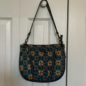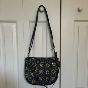 Elevate your style with this chic patterned shoulder bag. Featuring a vibrant mix of blue, yellow, and black, this bag is perfect for any occasion. The bag can be expanded using an exterior zipper. Crossbody strap is included. In like new condition. Brand is LUG.