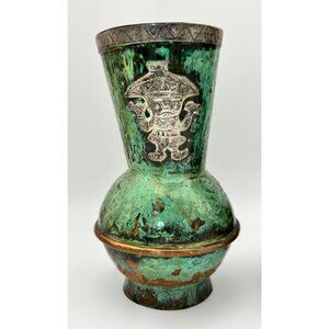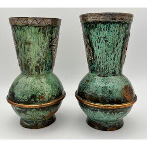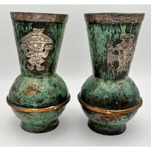 Mexican Mid-Century Silver Inlay Verdigris Vessels Matching pair 5" Tall
