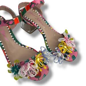Betsey Johnson Beaded Flower Embellished Sandals Size 6 Clear Block Heels EUC