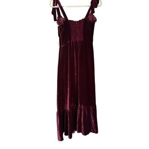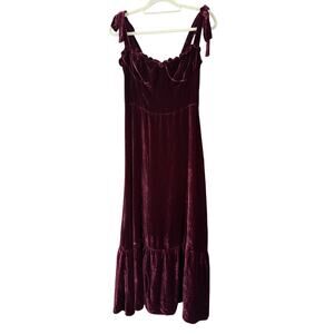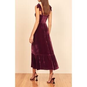 New with tag Reformation Antoinette Dress in rich plum velvet, size 6. A stunning romantic silhouette featuring a structured corset bodice with sweetheart neckline, bow-tied straps, and a ruffled hemline that moves beautifully. The plush velvet fabric adds a touch of vintage-inspired luxury, perfect for holiday events, weddings, or evening parties. Timeless, feminine, and eco-consciously made by Reformation.