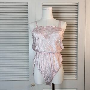 Elegant Natori pink satin lace bodysuit in a romantic, vintage-inspired design. Features delicate embroidered lace trim, adjustable straps, and soft satin fabric with a light sheen. Snap closure at the bottom for convenience. A beautiful lingerie or sleepwear piece that blends feminine charm with timeless style.
