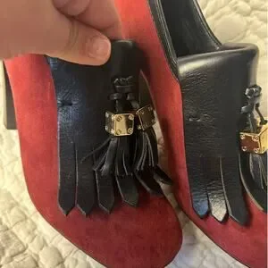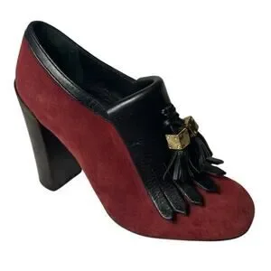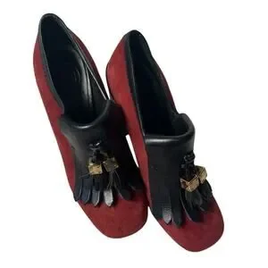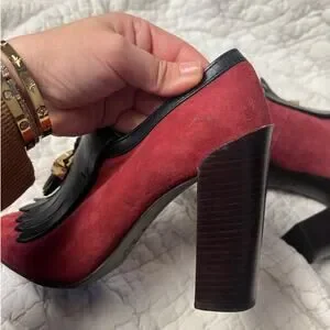 Tory Burch Red Black Suede Leather Tassel Chunky Square Toe Heels Size 7