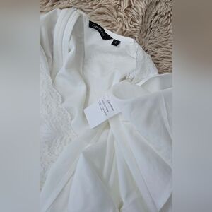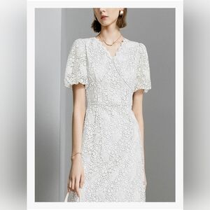 •The dress is designed with puff sleeves and elastic cuffs, giving it a playful yet elegant vibe. The overall silhouette is flattering, with a clean, simple cut that lets the intricate lace take center stage, creating a chic and romantic look.
