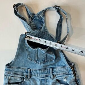 Gently loved- no flaws. Distressed, chest, front and back pockets. Side zip, belt loops, adjustable clasps, stretchy.