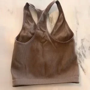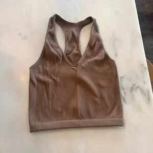 Ribbed tank with racerback design. Soft and stretchy fabric. Perfect for layering or lounging.