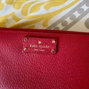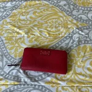 Chic Kate Spade wallet in vibrant red. Sleek design with gold-tone accents. Ideal for daily use.