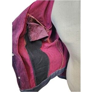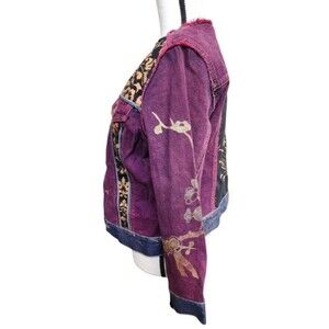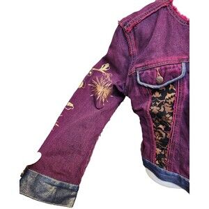 The EXPRESS Denim Jacket in size Large is a stylish and versatile piece perfect for travel, casual outings, or workwear. Made from cotton denim with beautiful brocade panels and beaded accents, this boho-inspired jacket features a button closure, collarless design, and long sleeves. The purple floral pattern adds a touch of art and 90s bohemian flair to the classic fit jacket, making it suitable for all seasons and adding a pop of color to your wardrobe. Hand wash only to maintain the quality and enjoy this unique statement piece from Express. CLOTHING AND FABRIC ITEMS: All clothing and fabric items have been steam cleaned and/or washed.