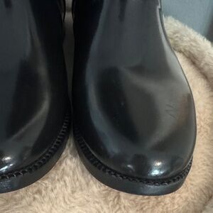 Glossy black boots with sleek buckle. Ideal for winter weather.