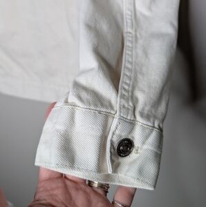 Off white denim jacket with manufactured distressing. EUC.