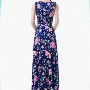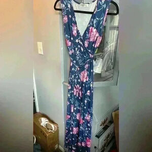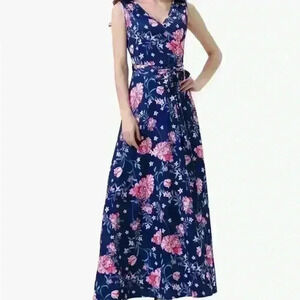 Sleeveless V Neck Vintage Floral Faux Wrap Maxi Dress (M)