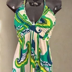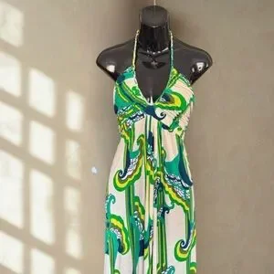 Chic halter maxi dress with bold green and blue design. Ideal for stylish outings.