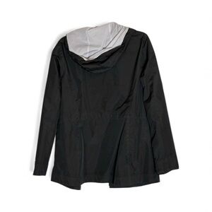 Womens black rain jacket by Free Country. Features a hood and zippered pockets.
