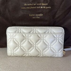This luxurious Kate Spade wallet features a stunning quilted design in pristine white leather, exuding elegance and sophistication. The zip-around style ensures your essentials are securely stored, while the gold-tone brand plate adds a touch of glamour. Perfect for any occasion, this wallet combines functionality with timeless fashion. Nice soft leather no call out