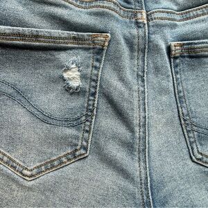 Chic light blue jean shorts with a distressed finish. Features a frayed hem for a trendy look. Ideal for casual outings.