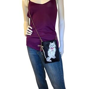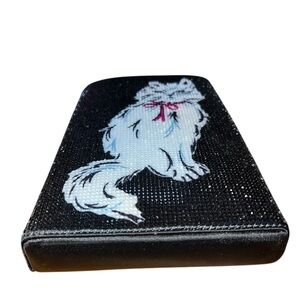 The Kate Spade Whiskers Cat Crystal Crossbody Black Bag is a limited edition handbag featuring a charming cat design with crystal accents. This small-sized purse is perfect for formal occasions like weddings or parties, with a magnetic closure and a silver crossbody strap handle. Made of quality polyester and lined with fabric, this stylish bag from Kate Spade New York showcases a black exterior with a white cat theme, making it a perfect accessory for those who love unique and elegant handbags.