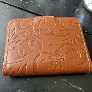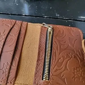 New never used wallet from Portland Leather Goods. Small medium brown. tooled leather with a snap closure and zippered change pocket.