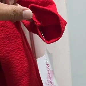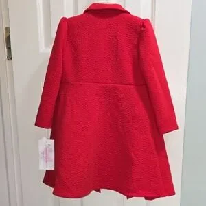 Charming red coat featuring gold bow accents and buttons. This is a two-piece set composed of the red coat and plaid dress. Perfect for a stylish look. Color may vary as pictures were taken with and without flash. Please review all pictures and let me know if you have any questions.