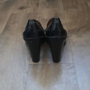 Excellent condition.Chic black leather loafers with a stylish heel. Perfect for elegant occasions.