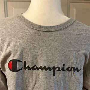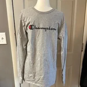 Champion long sleeve shirt in gray. Features bold logo on front. Comfortable and stylish.