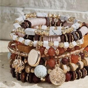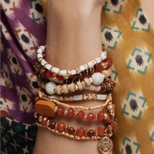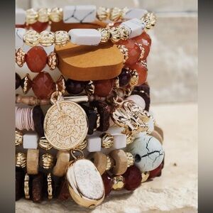 Elevate your style with this stunning multi-layered bracelet set. Featuring a blend of gold, white, brown, and red beads, this bohemian accessory adds a touch of elegance to any outfit. Perfect for any occasion.