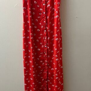 Red midi dress with floral pattern. Wilfred brand from Aritzia. Features a ruched strap design. Button front.
