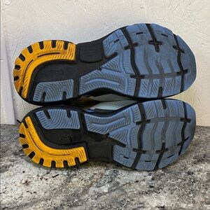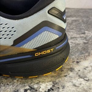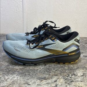 Sleek Brooks athletic shoes in light blue. Black and gold accents add style. Perfect for running.