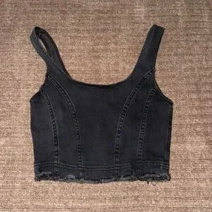 Stylish black denim crop top featuring a front zipper. Perfect for casual outings.