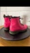 Iconic Dr. Martens Delaney boots in bold fuchsia pink leather. Lace-up and side zipper closure. The soles are in excellent condition, sturdy and ready to wear. The leather shows visible creases and surface cracking, with a few small stains, but the boots remain solid and full of character.