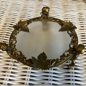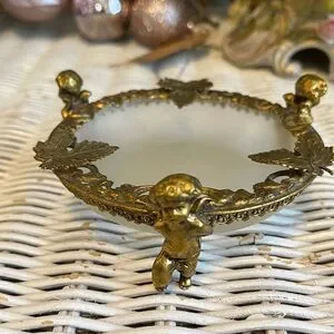 VINTAGE Ormolu style Brass Leaf Trinket Glass Dish Frosted Glass With Cherubs