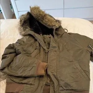 Stylish olive green jacket with a cozy faux fur hood. Perfect for chilly days.