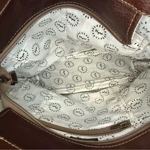 Stylish cowhide bag with fringe detailing. Features a unique brown and white pattern. Perfect for adding a rustic touch to any outfit. Comes with shoulder strap. Interior zip pocket and patterned lining.