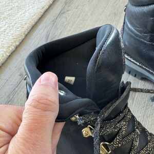 Elevate your style with these chic black lace-up boots, featuring a unique crest detail. They strike the perfect balance between rugged and fashionable. Have been kept in near perfect condition.