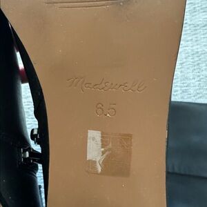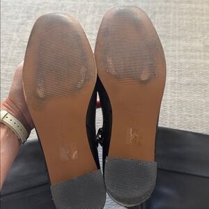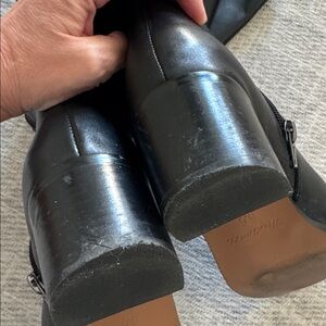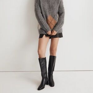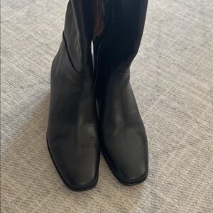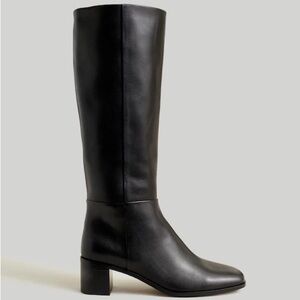 Sleek black leather boots. Knee-high design. Chunky heel for comfort.