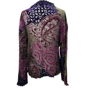 Add a touch of magic to your wardrobe with this stunning multicolor velvet cardigan from Caelian. Featuring an open design with trim lace accents, this cardigan is perfect for any occasion from casual to formal. The tight-knit pattern and long sleeves make it a great choice for cooler weather, while the sheer fabric type and whimsical design add a touch of fairy-like charm.