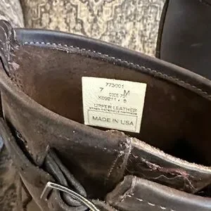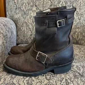 FRYE- Stylish brown leather boots with buckle details. Perfect for a rugged look.