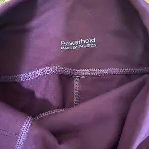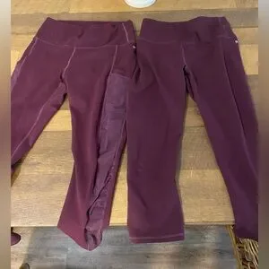 Two pairs of matching deep purple, eggplant Fabletics powerhold leggings.
