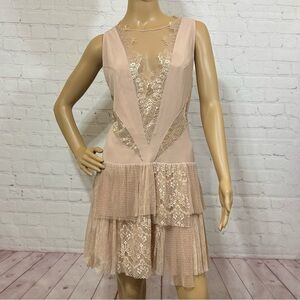 FREE PEOPLE “Dove Dress” Partial sheer Lace Drop waist tiered Skirt Size 10 EUC