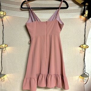 Blush Pink Wrap Mini Dress – Ruffle Hem, Adjustable Waist, Minor Flaw