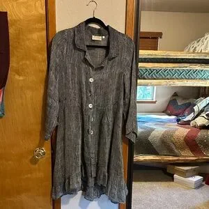 Stylish gray button-up dress with long sleeves. Features a ruffled hem for added flair.